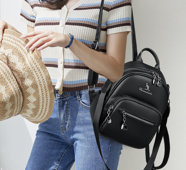 Невеликого розміру жіночий міський рюкзак, висота рюкзака 25 см, ширина 21 см, глибина 10 см. Закривається жіночий рюкзак на блискавку, всередині одне відділення, кишенька на блискавці, дві відкриті кишені. Підкладка - цупка нейлонова тканина. Рюкзак має зовнішню кишеню на блискавці, відкриті бічні, задню на блискавці, міцні шлейки зі шкірозамінника і нейлонової тканини регульованої довжини. Фурнітура виконана в срібному кольорі. В комплекті шлейка із нейлонової тканини яка кріпиться на карабіни.